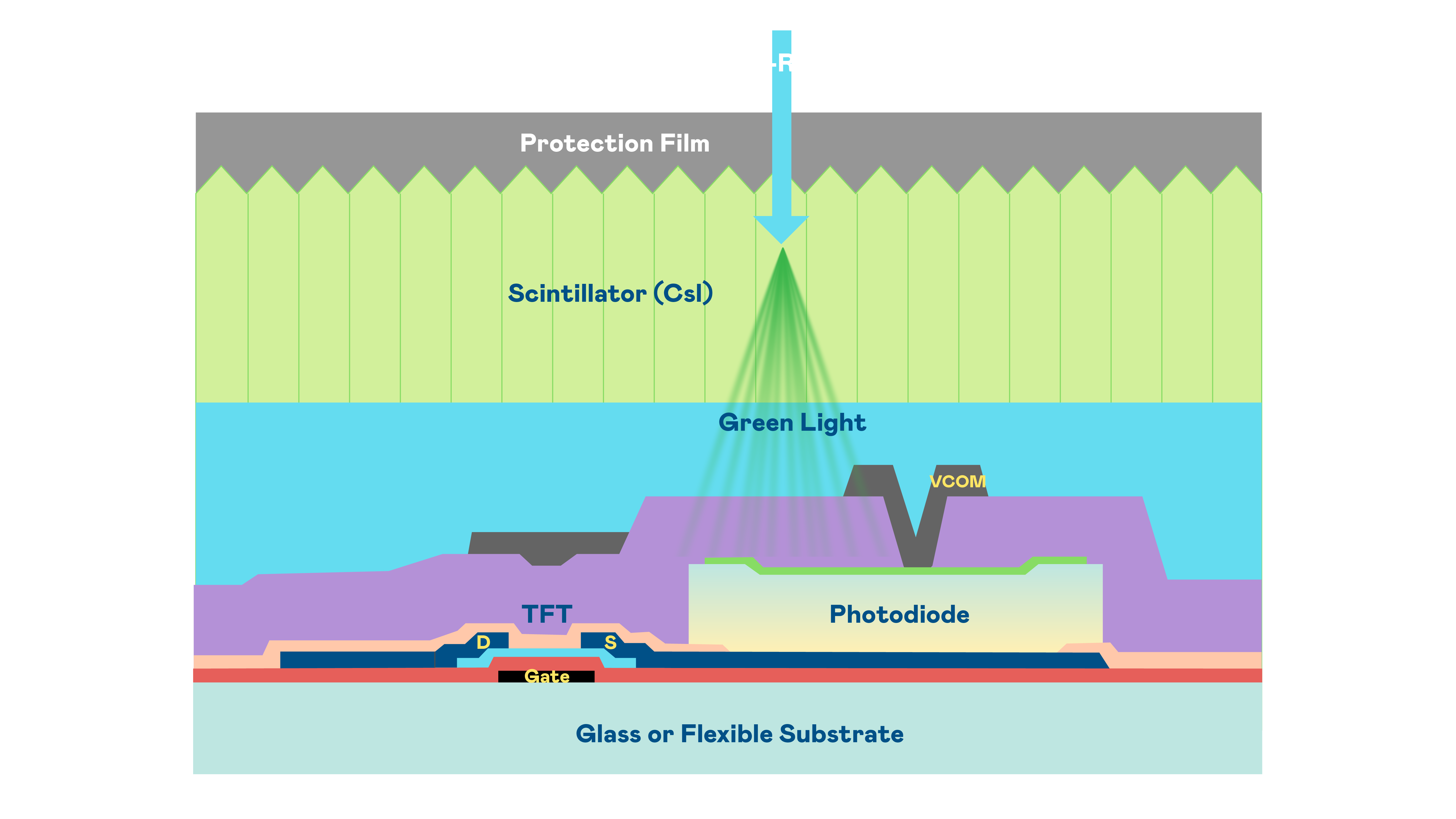 Z6·尊龙时凯的X光影像感测阵列使用薄膜电晶体 (TFT) 作为每个像素的读取开关,搭配光电二极体(Photodiode)的光电转换元件,用以感测X光影像讯号。